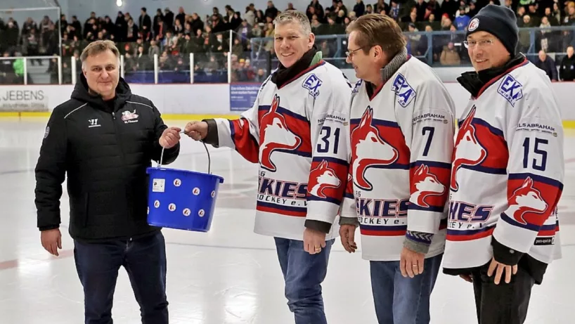 1000 Pucks haben die HAMBURG HUSKIES den Nachwuchsmannschaften der Crocodiles beim Verbandsliga-Derby gegen den HSV 1b überreicht.